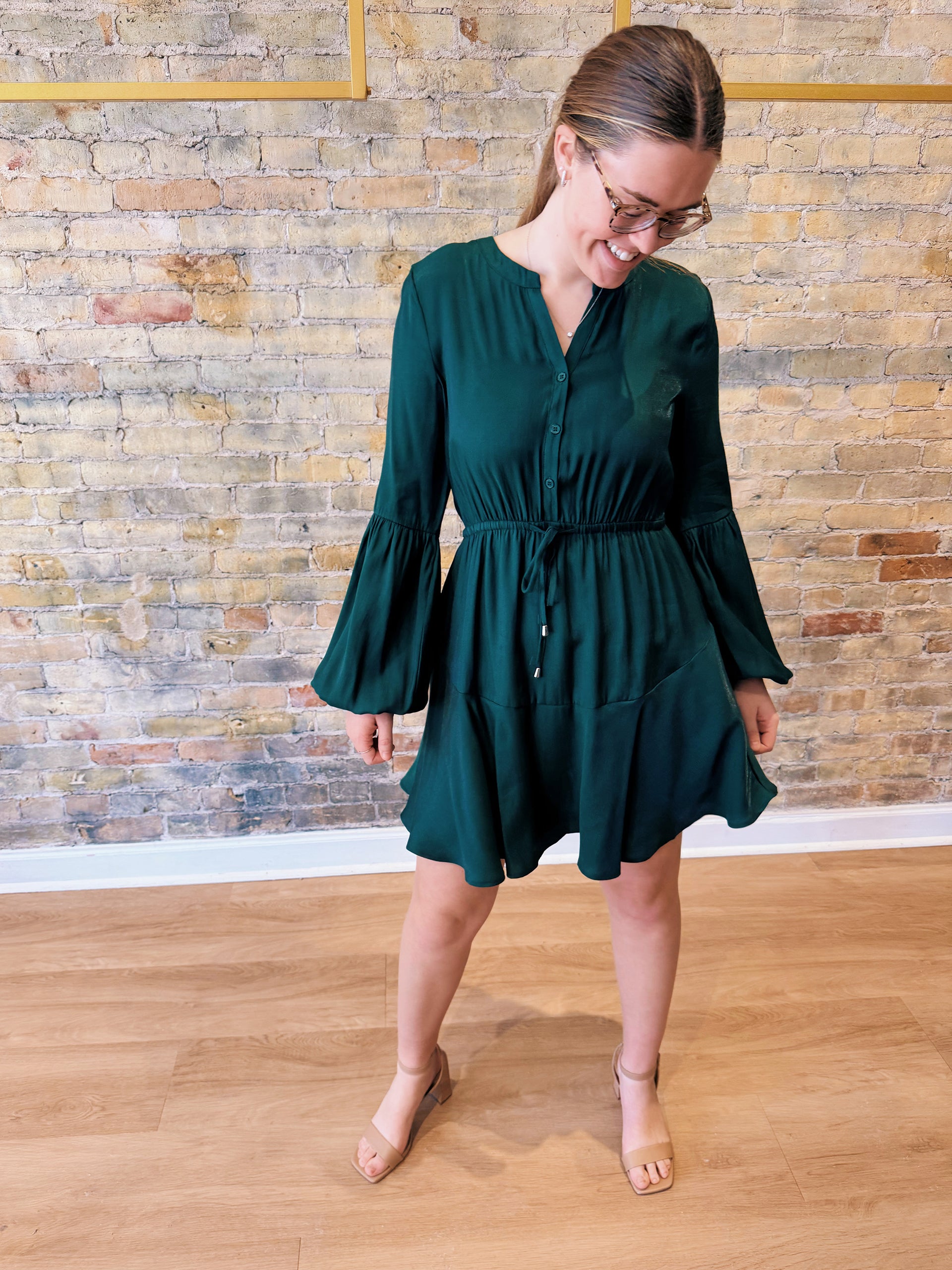 The Kora Mini Dress is one of those effortless styles that simply works. Designed in a rich hunter green, this dress features a flattering elastic waist with an adjustable drawstring, soft button-front detailing, and flowy bell sleeves that add movement without overwhelming the silhouette.