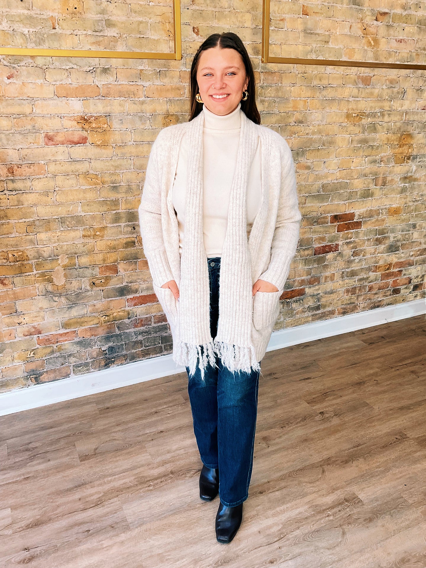 Stay warm and chic this season with our Scarf Cardigan. The built-in scarf adds a unique touch to this oatmeal-colored cardigan, making it a versatile addition to your wardrobe. Keep cozy and on-trend all winter long!