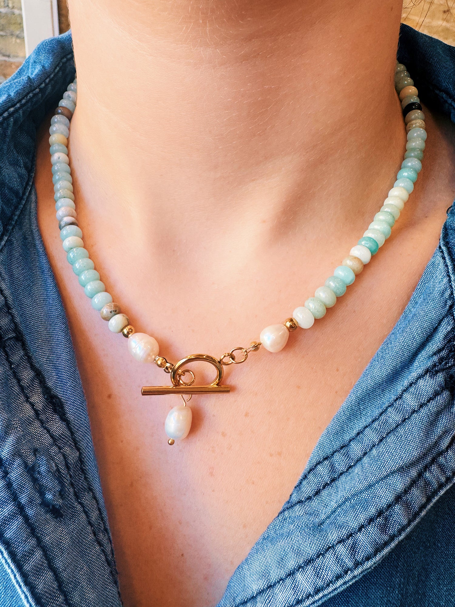 Timeless elegance meets modern detail with this Genuine Stone Necklace. Designed with smooth, polished stone beads in soft aqua hues and accented by luminous pearls, this piece is finished with a chic gold bar closure that doubles as a stylish focal point.