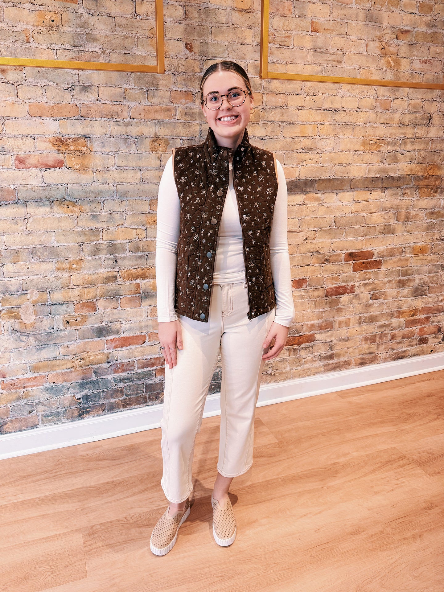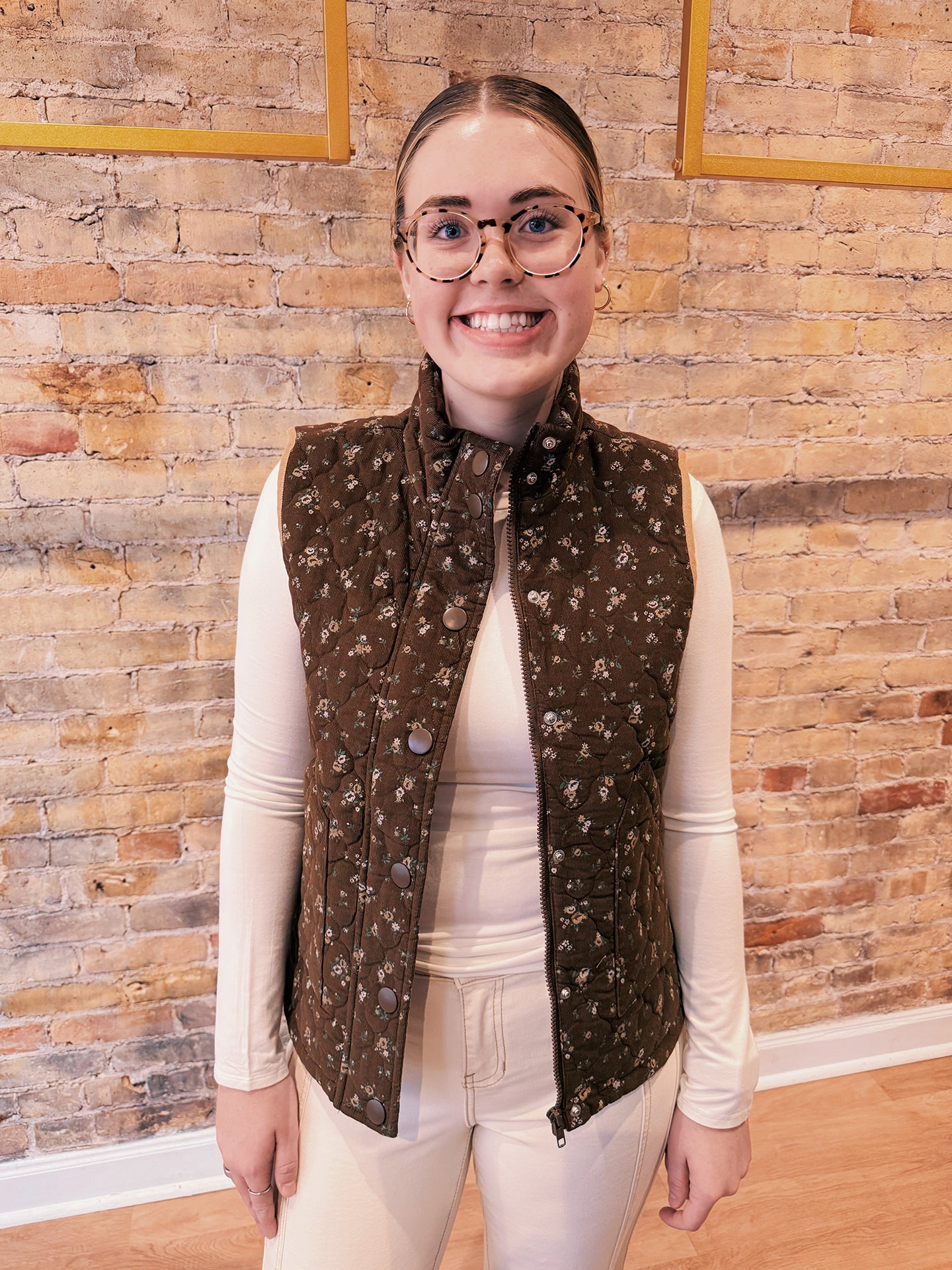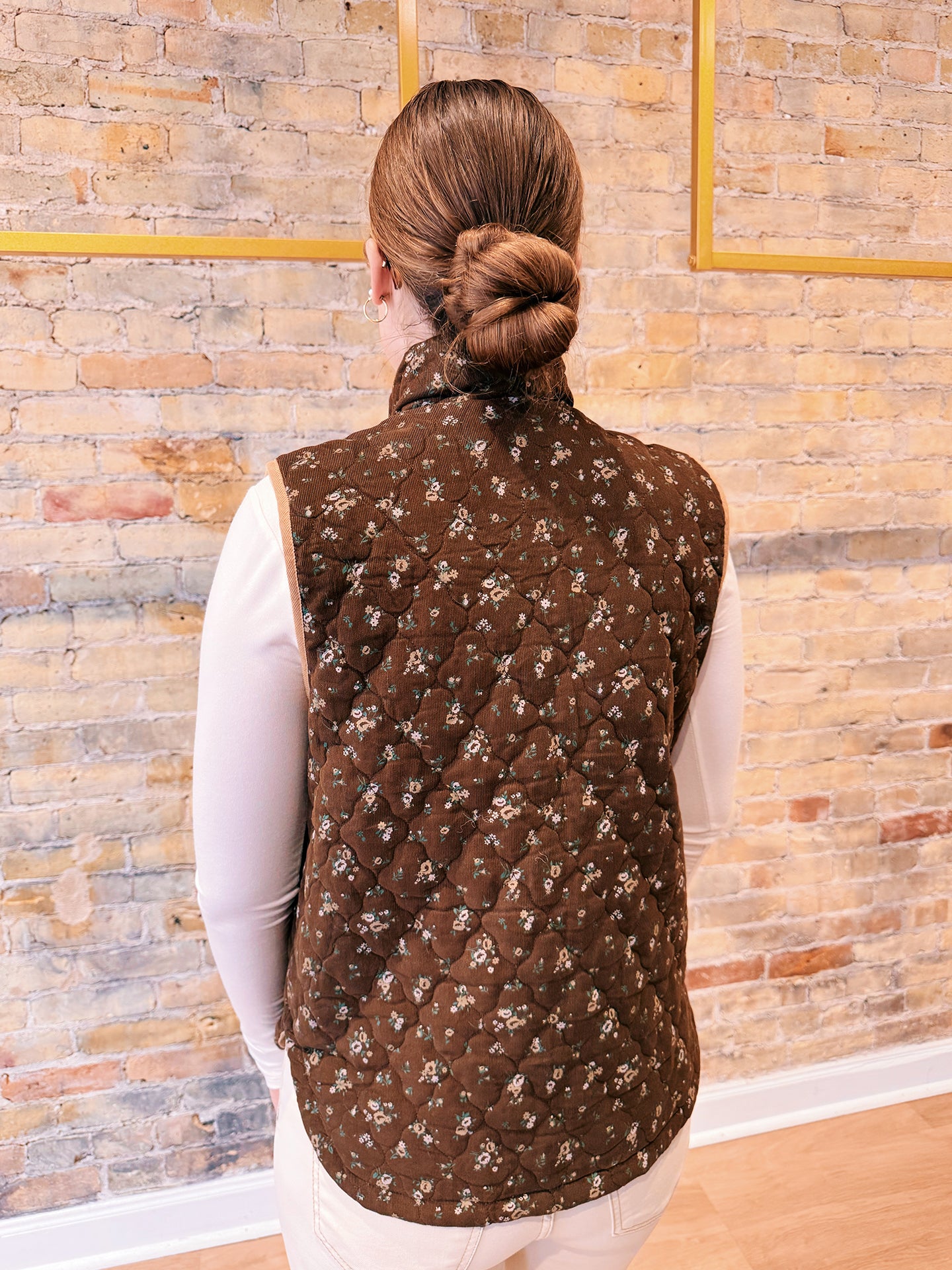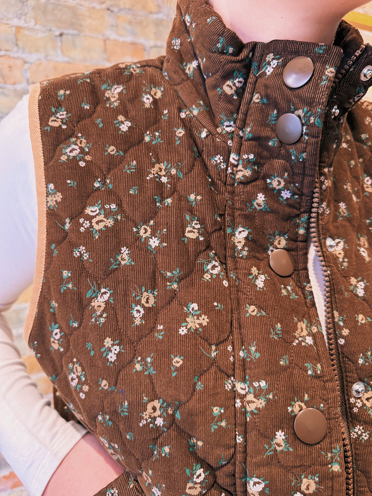 Crafted in a rich chocolate-toned quilted corduroy with delicate floral detailing, this vest brings a soft feminine touch to a timeless layering essential. Lightweight yet cozy, it’s the perfect piece for those in-between Spring days when you want a little warmth without the bulk of a jacket.