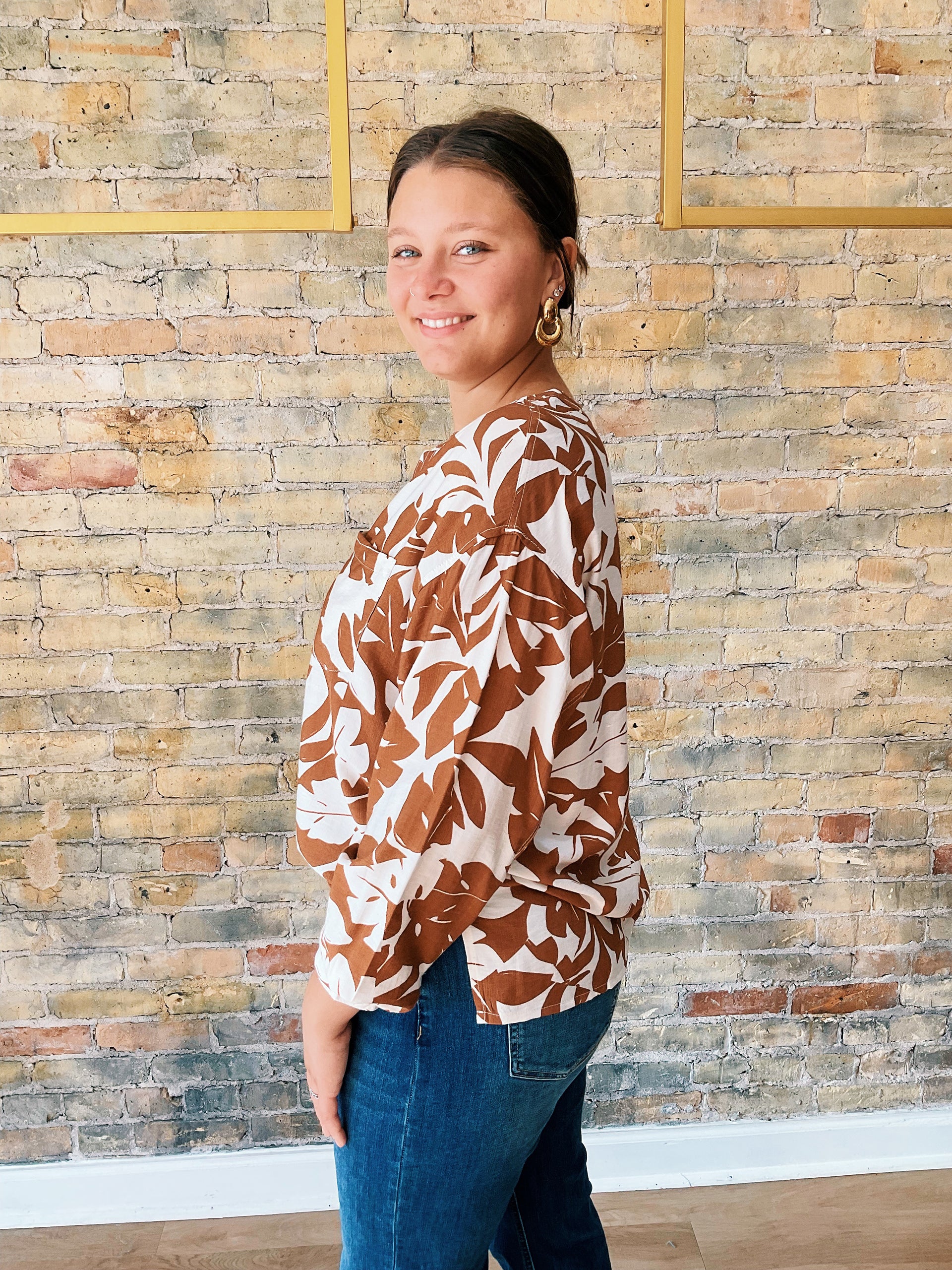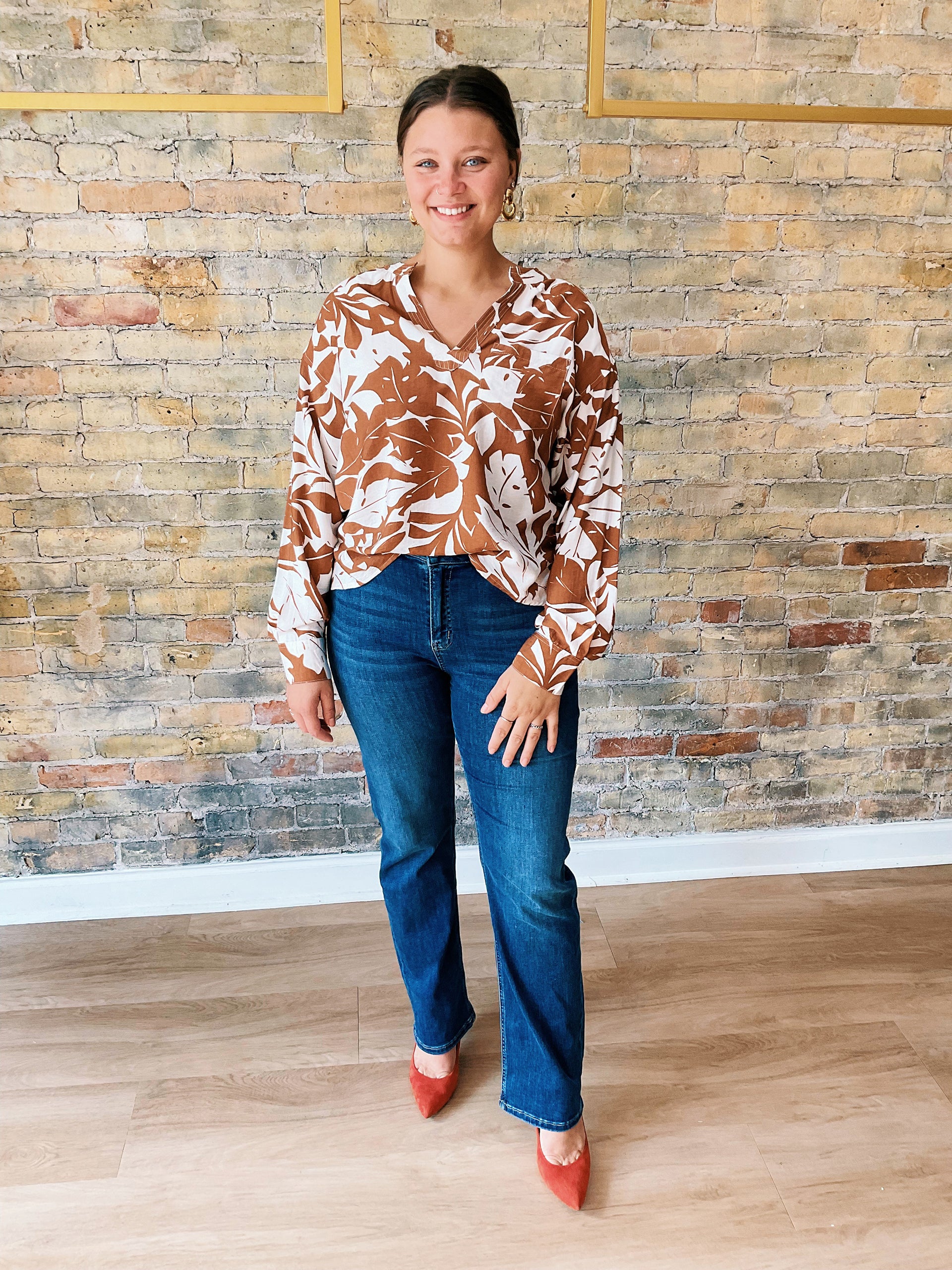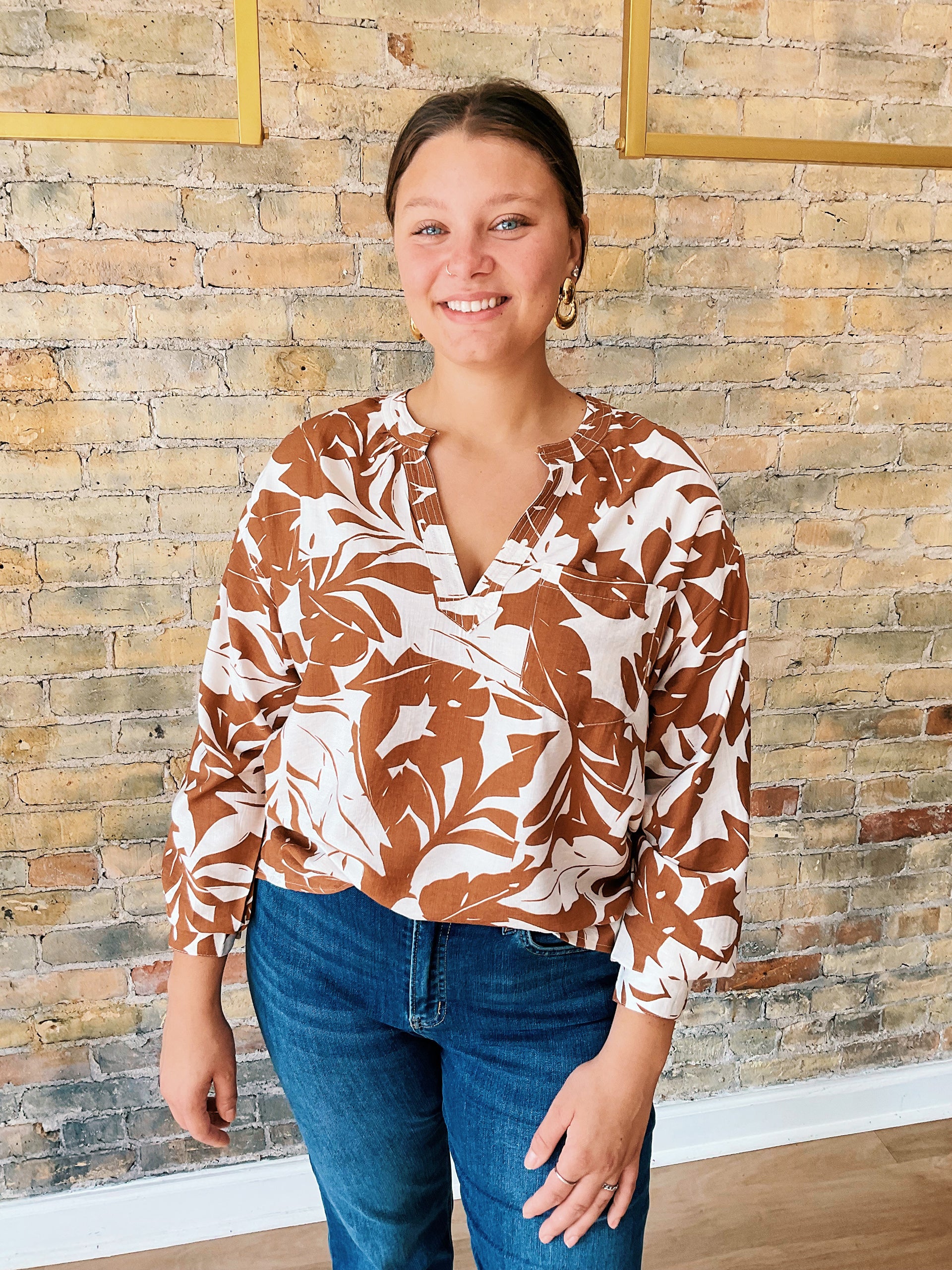 Step into fall with the Liliana Top, designed to flatter and brighten your seasonal wardrobe. Featuring a V-neckline that elongates and frames the face, relaxed 3/4 sleeves, and a drapey fit, this 100% polyester top is lightweight and easy to wear all day. The warm fall tones pair perfectly with denim, trousers, or skirts, while the lively print gives your outfit a little personality boost.