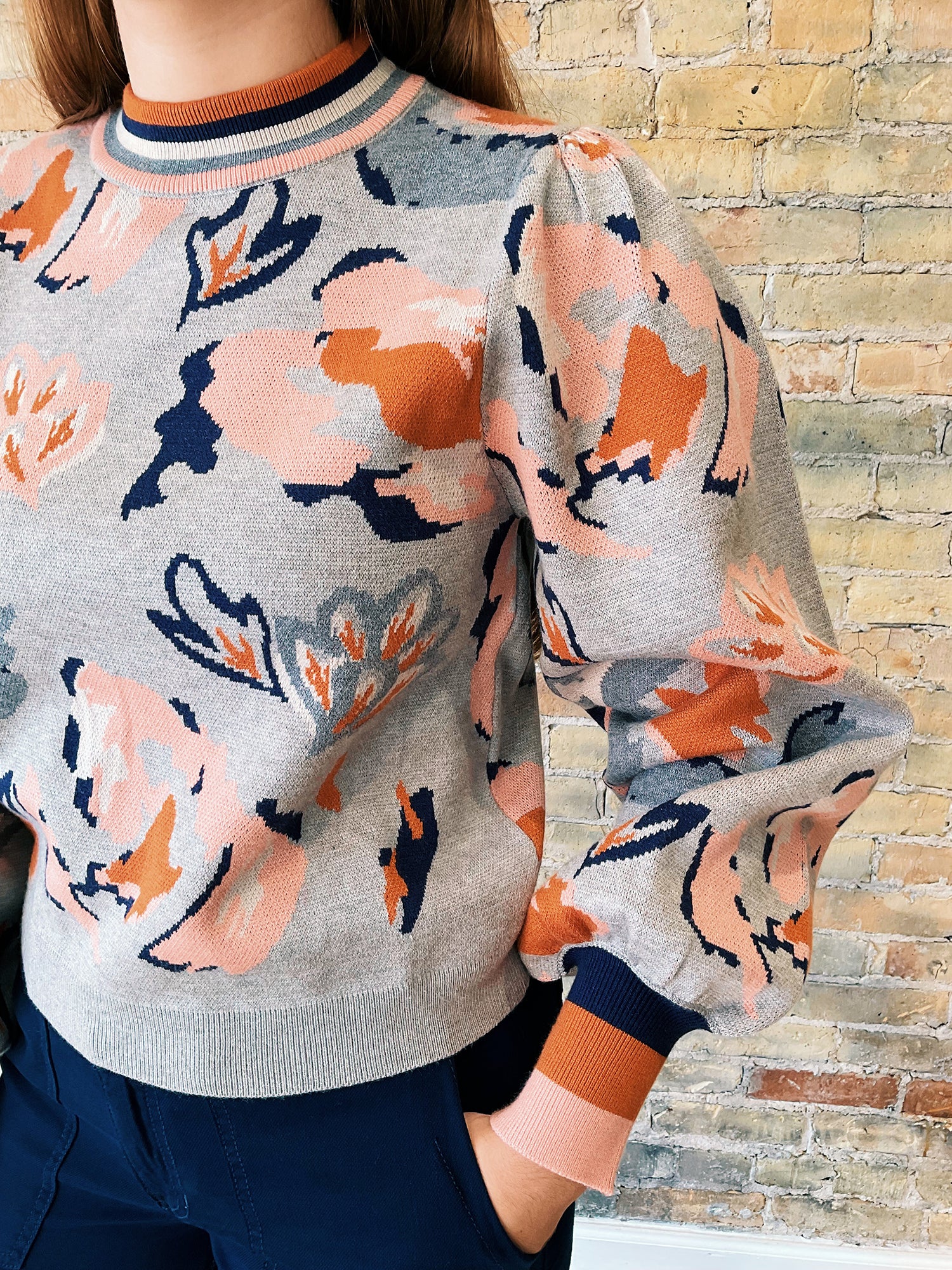Meet the Mirna Sweater — a standout knit designed to deliver modern femininity with effortless wearability. This beautifully patterned sweater blends soft neutrals with warm peach and deep navy accents, creating a fresh, abstract floral that instantly elevates any look.