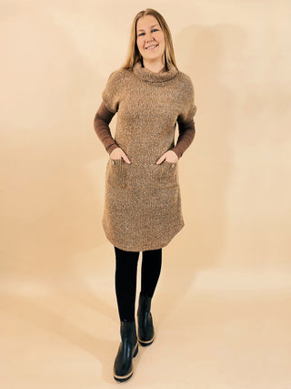 A woman wearing a striped multicolored long-sleeve pullover sweater with a crew neck.