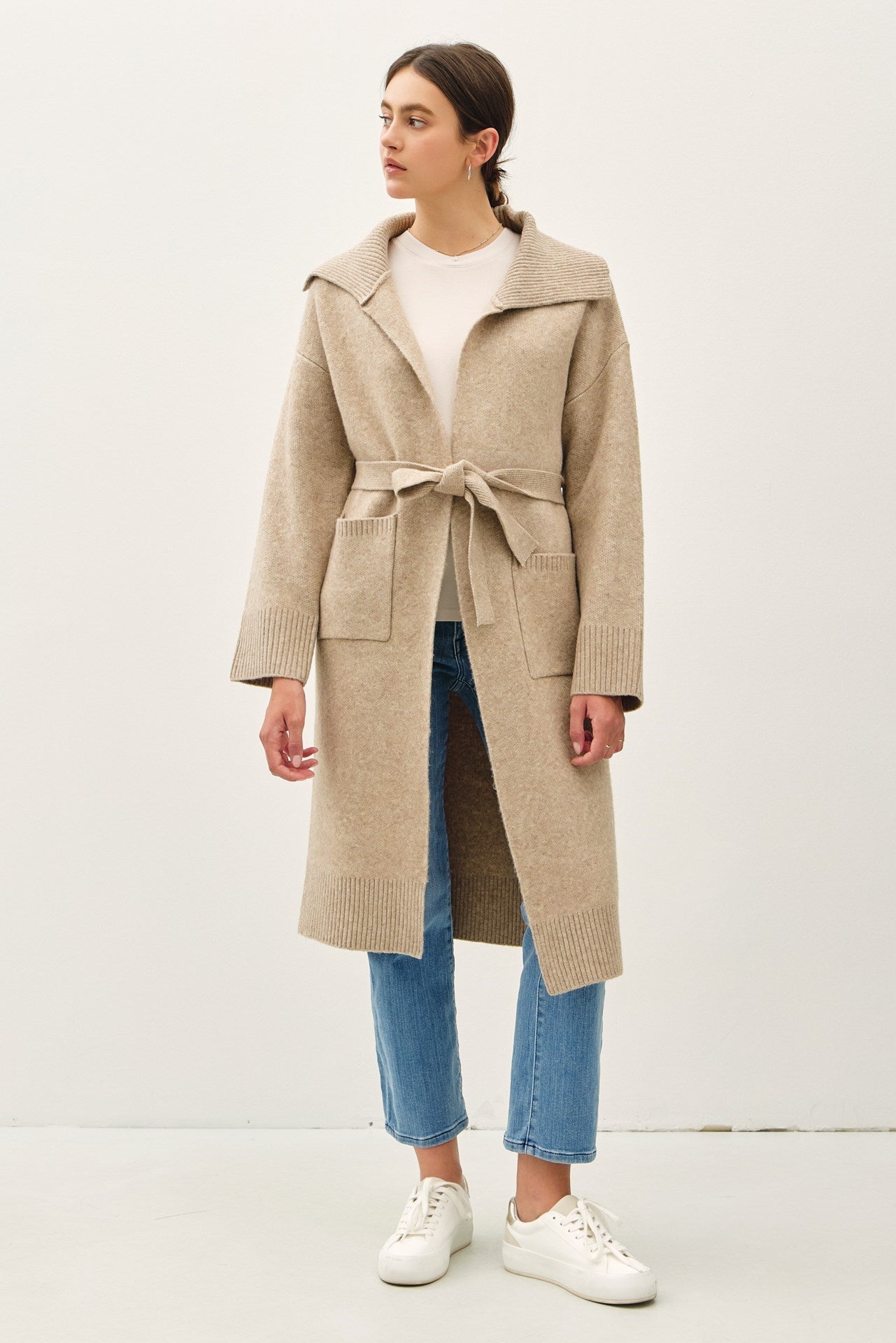 Stay warm and stylish this fall and winter with our Aspen Cardigan. This unique "coatigan" features a large ribbed collar and a playful Peter Pan collar, along with front patch pockets, long sleeves, and a front tie closure. Made with a wool blend for extra warmth and comfort, this oversized and relaxed silhouette falls below the knee for a statement-making look. Perfect for layering during the colder months, this cardigan is a must-have for any fashion-forward individual.