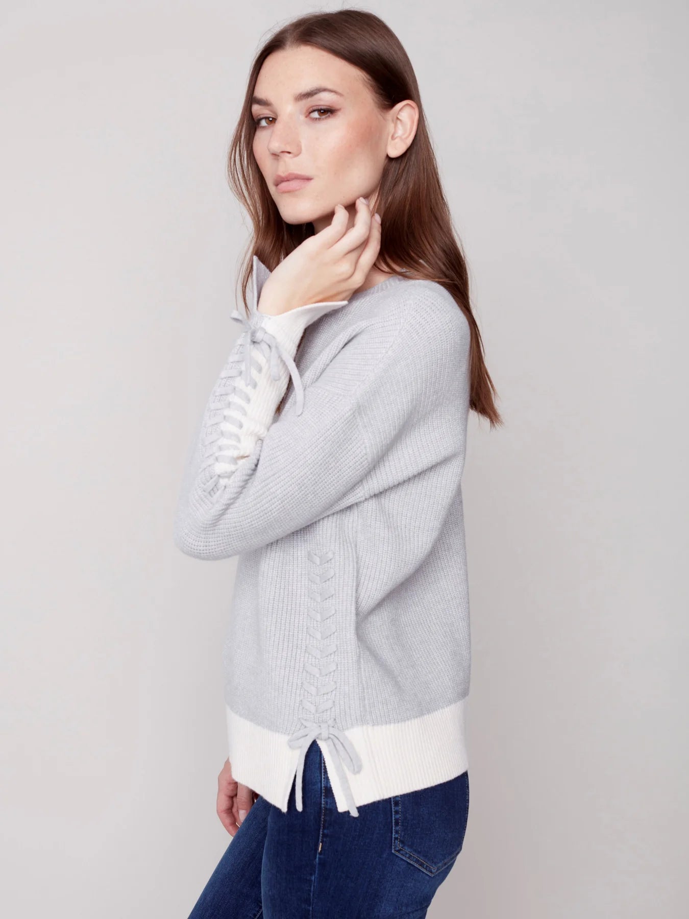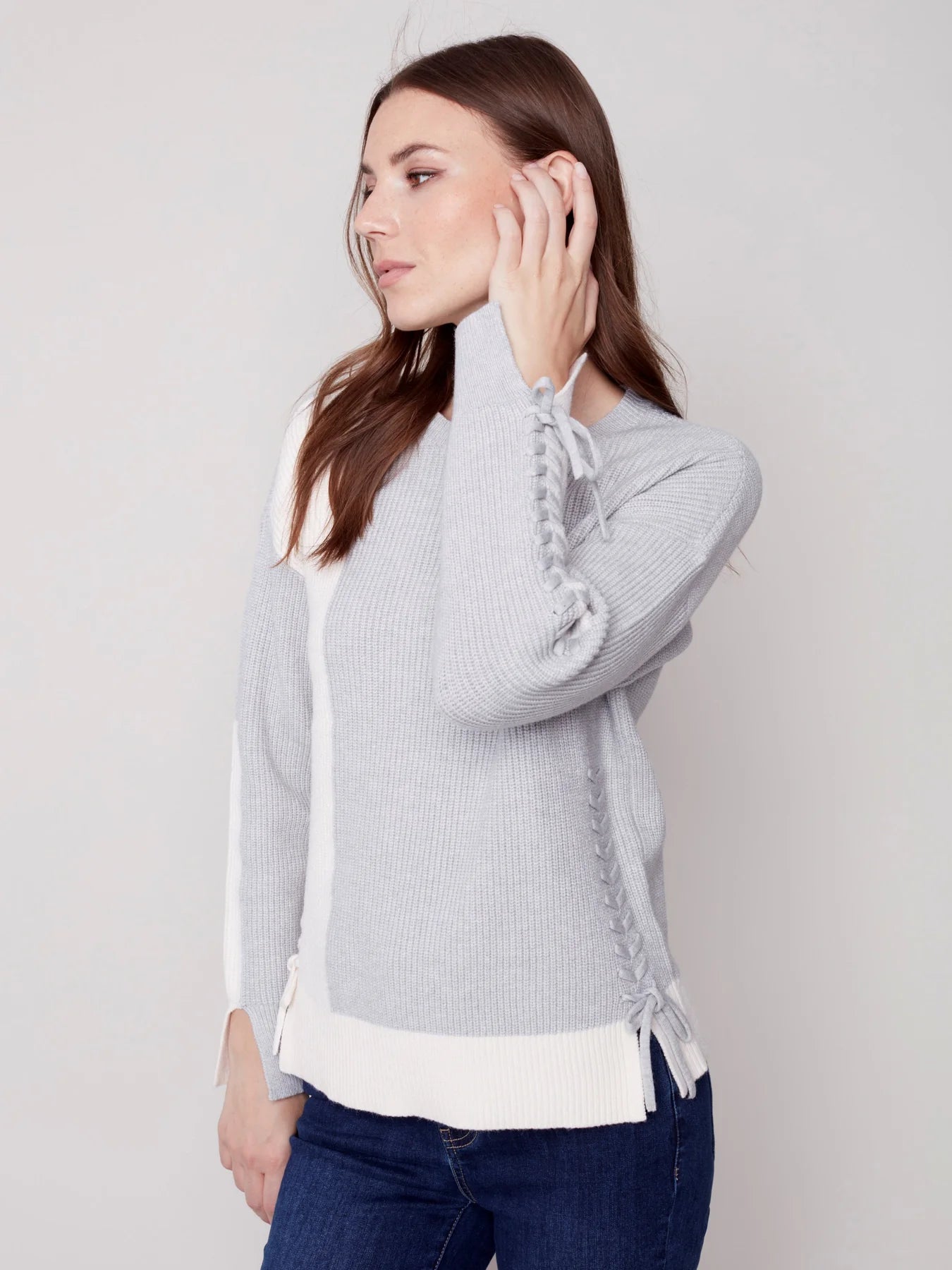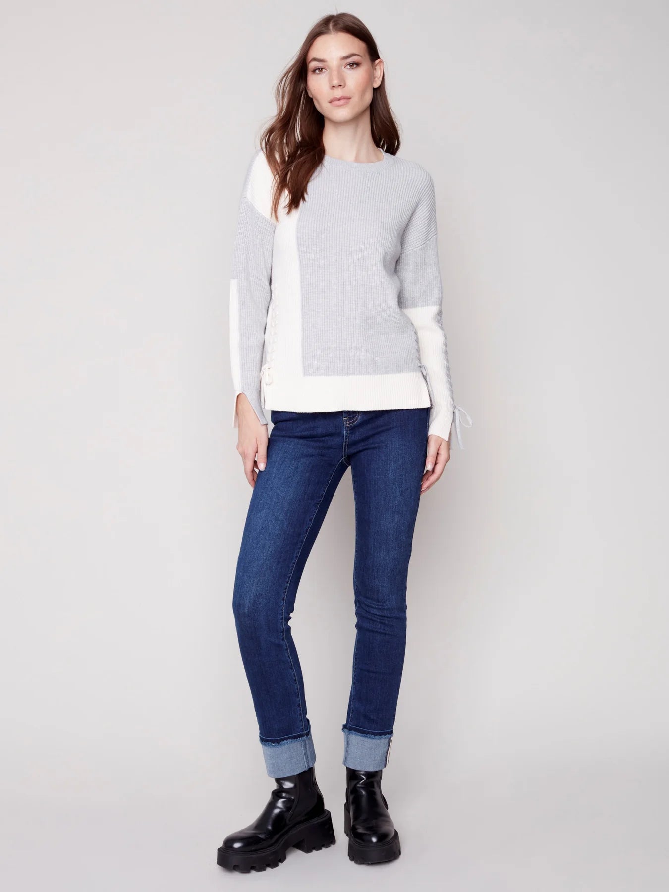 This will become your new favorite winter sweater. The color block design, classic crew neck and relaxed fit are winners in themselves, but the real showstopper is the lace detail on the sleeve and sides.