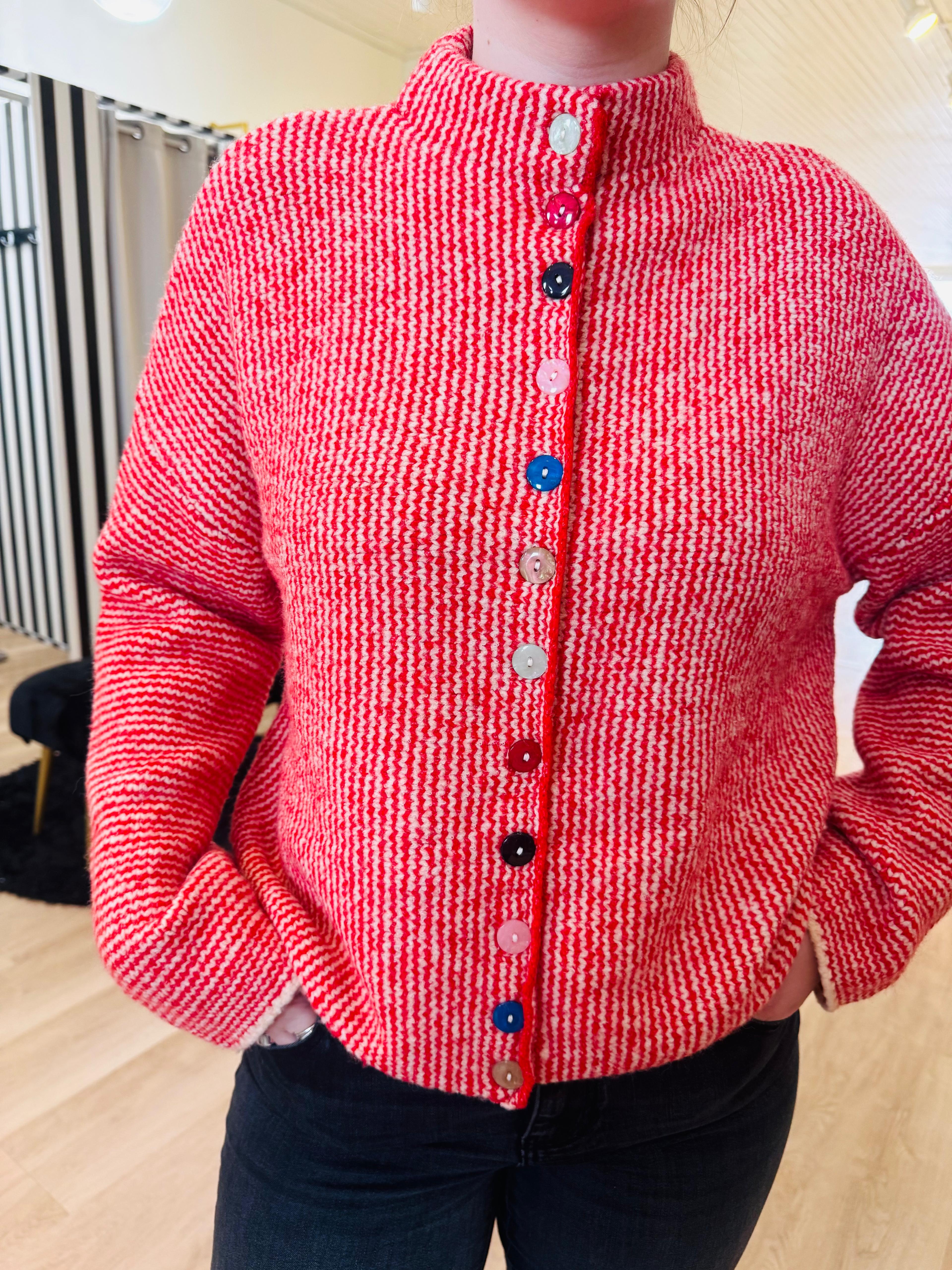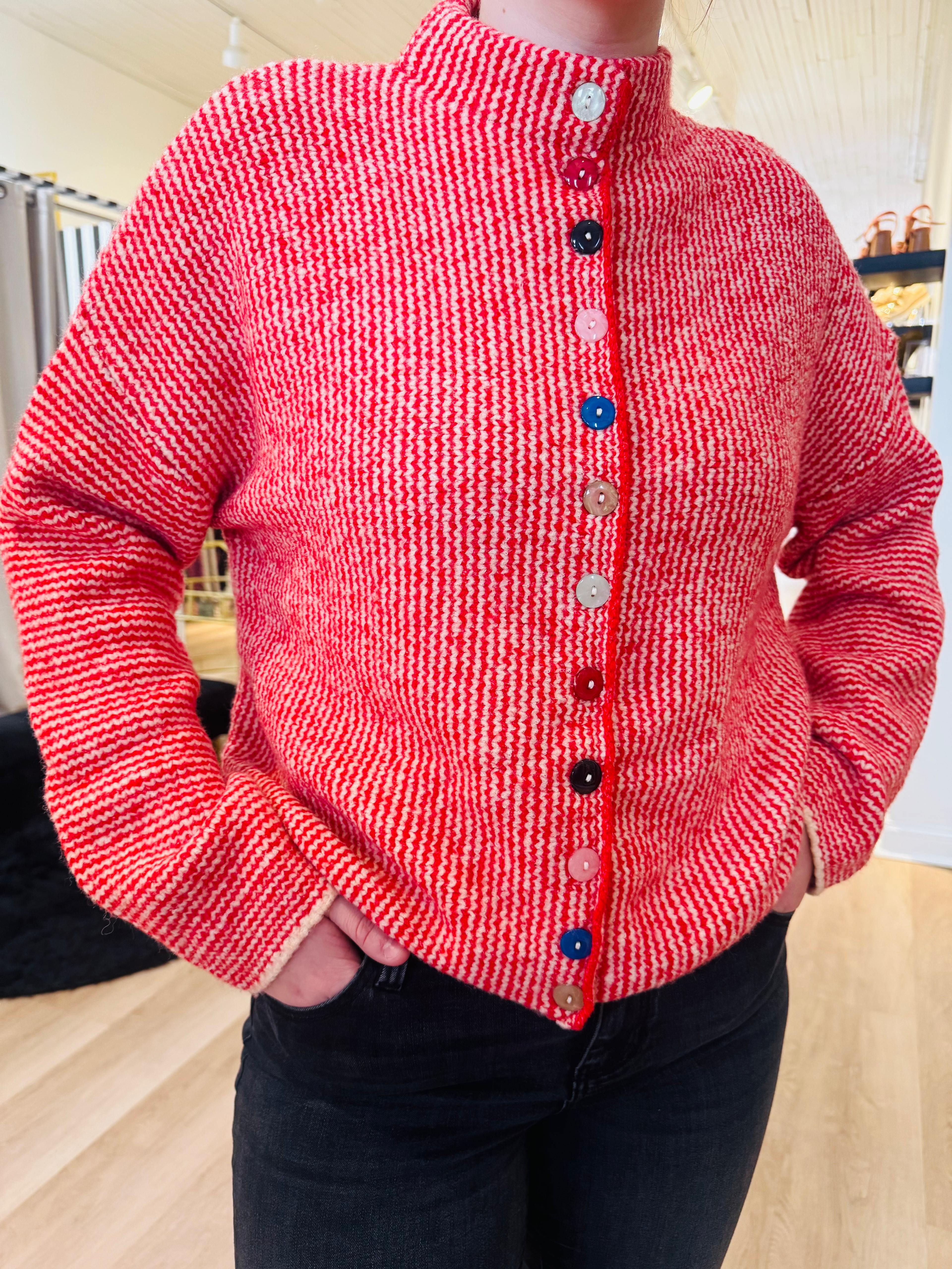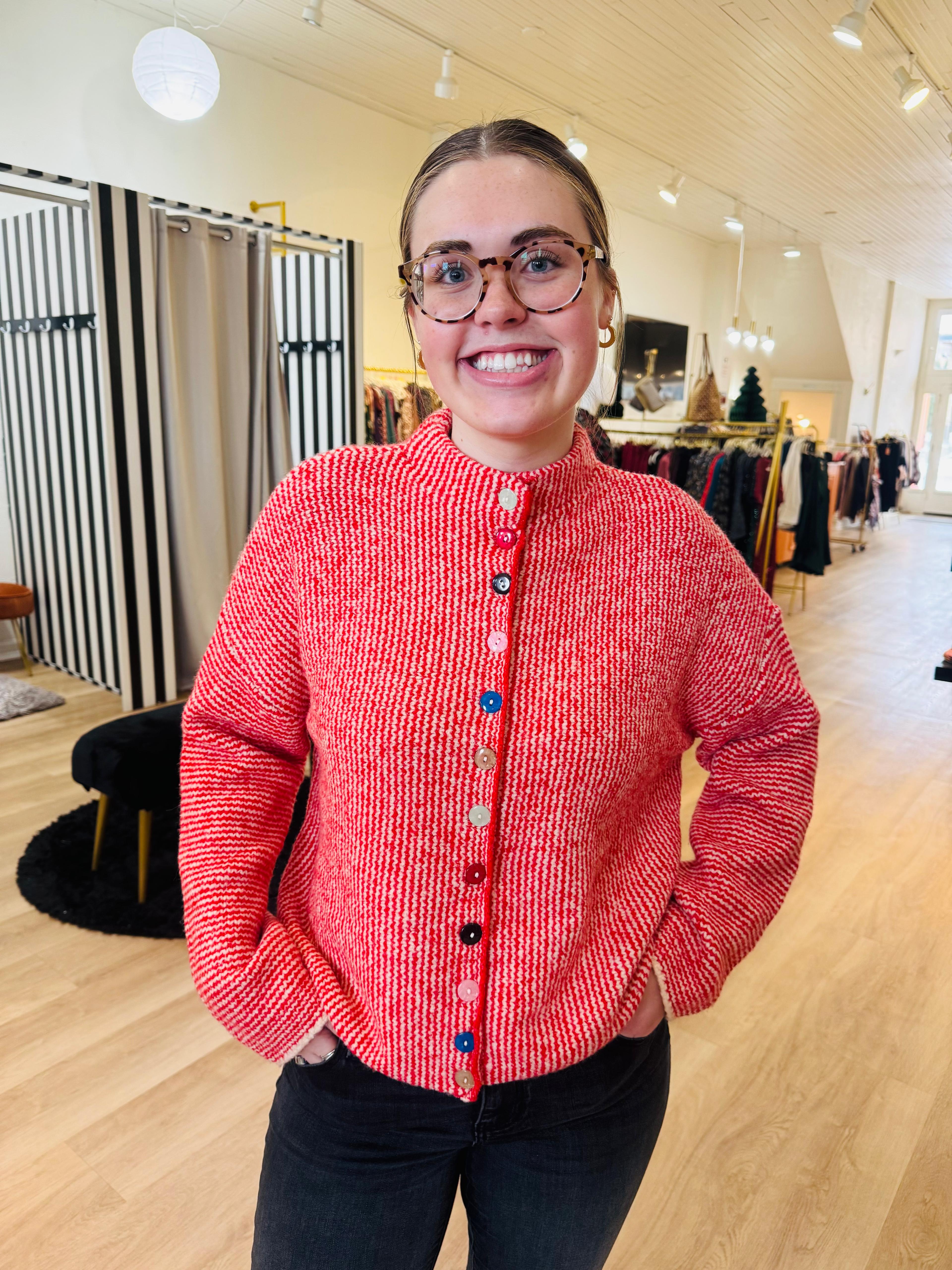 Crafted in a rich red knit with playful, multicolor button detailing, this sweater strikes the perfect balance between cozy and statement-making. The texture adds depth, while the thoughtful stretch keeps it comfortable and easy to wear throughout your day.