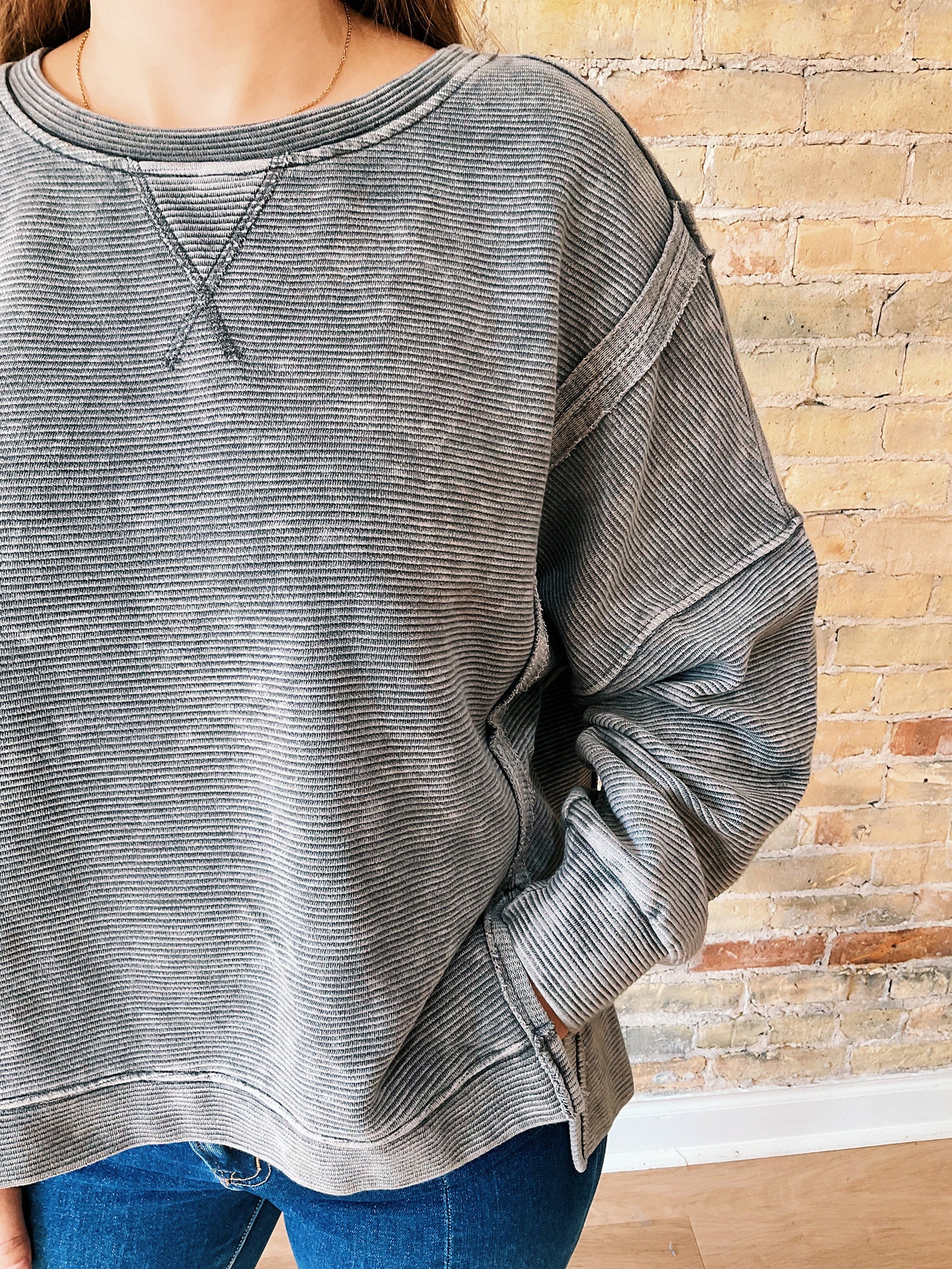 The Rowan Knit Pullover brings effortless edge to your everyday wardrobe. Made from a soft cotton-blend knit with a washed charcoal finish, this top features raw trim, exposed seam details, and a relaxed drop-shoulder silhouette. Side slits at the hem offer ease of movement and subtle shape, while the ribbed crewneck and cuffs keep it grounded in comfort. An easy throw-on for coffee runs, weekend layering, or laid-back travel days.