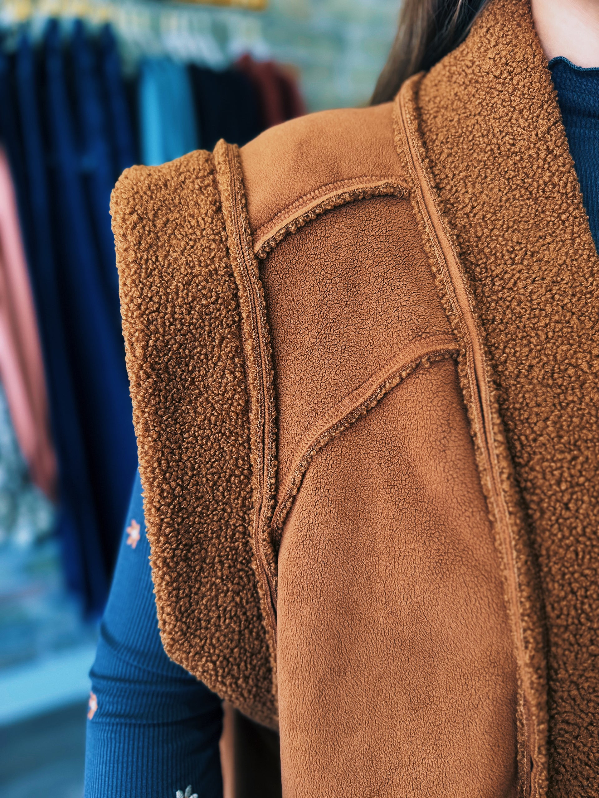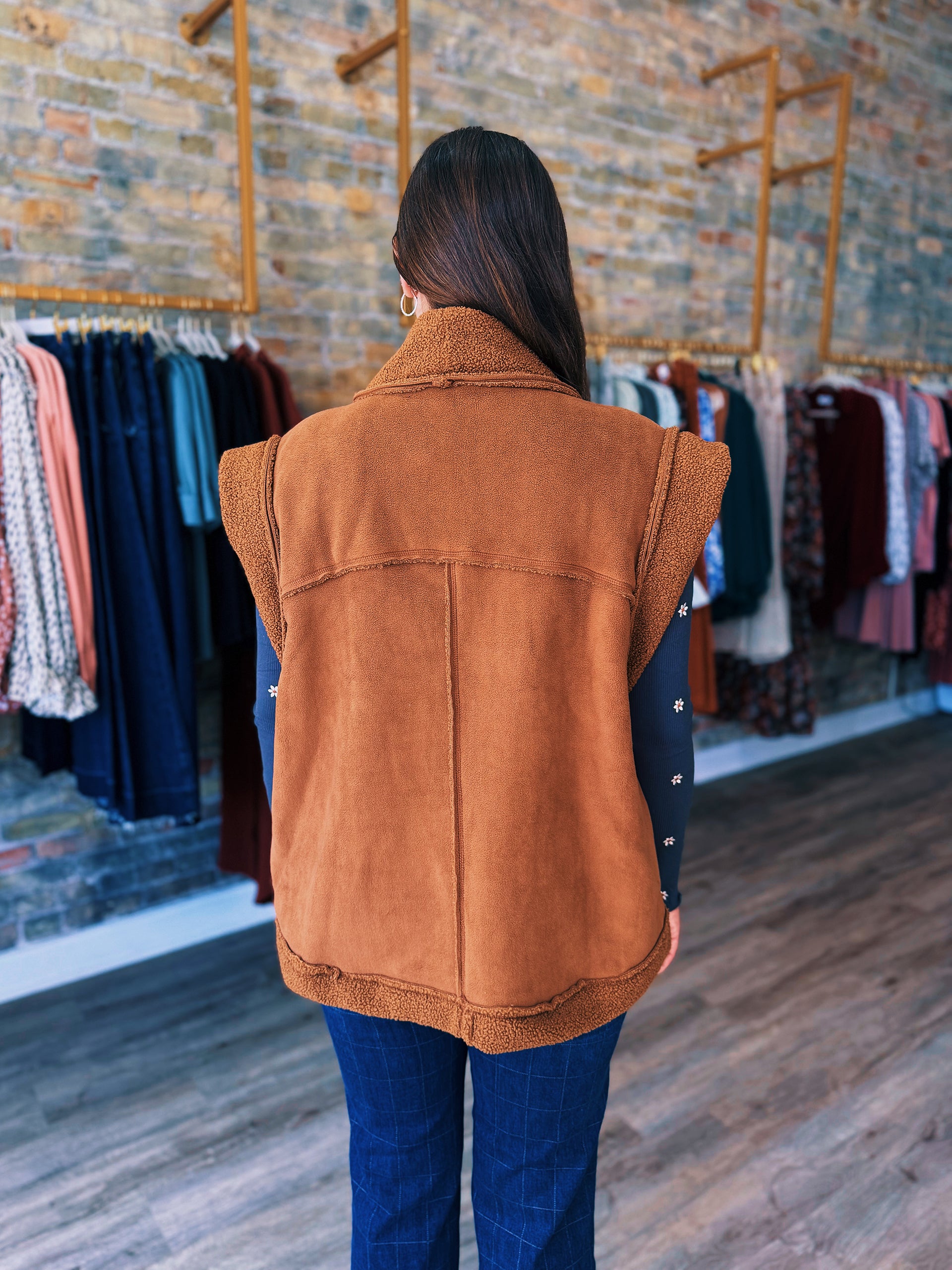 Introducing Nia Vest- the ultimate fall essential for colder days! Made with oversized suede and cozy sherpa lining, this vest is perfect for dressing up or down. With side pockets and unique textures, it's both functional and stylish. Stay warm and fashionable with Nia Vest!