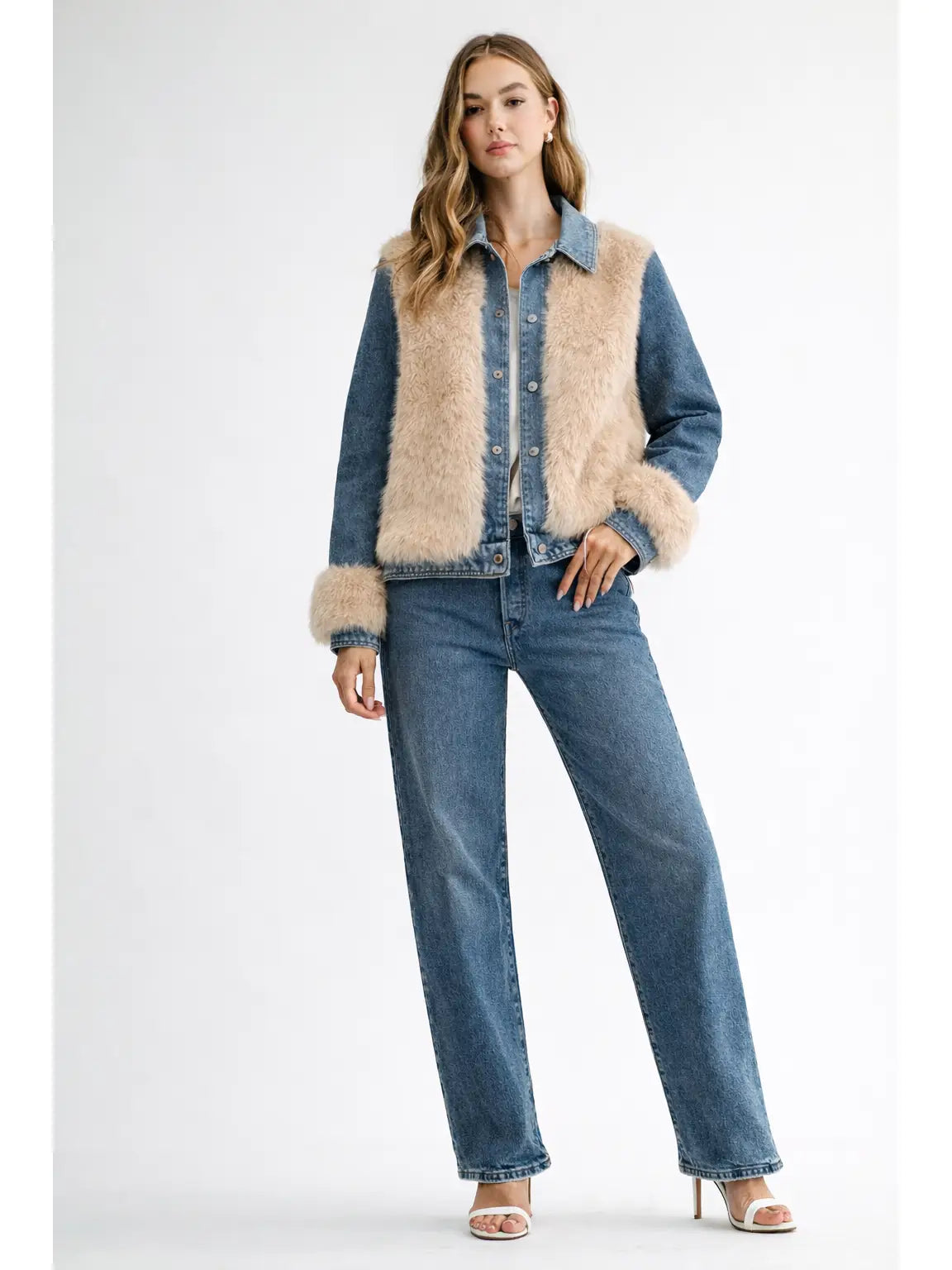 Stay cozy and chic in our faux fur panel denim jacket. The perfect blend of classic stone-washed denim with luxe fur texture. Structured collar, long sleeves with fur trim, pockets, fur front, and front metal screw tack buttons for closure. Inside lining is a padded quilted satin. Loose easy relax fit. Perfect for the fall and winter seasons. Stylish and comfort.